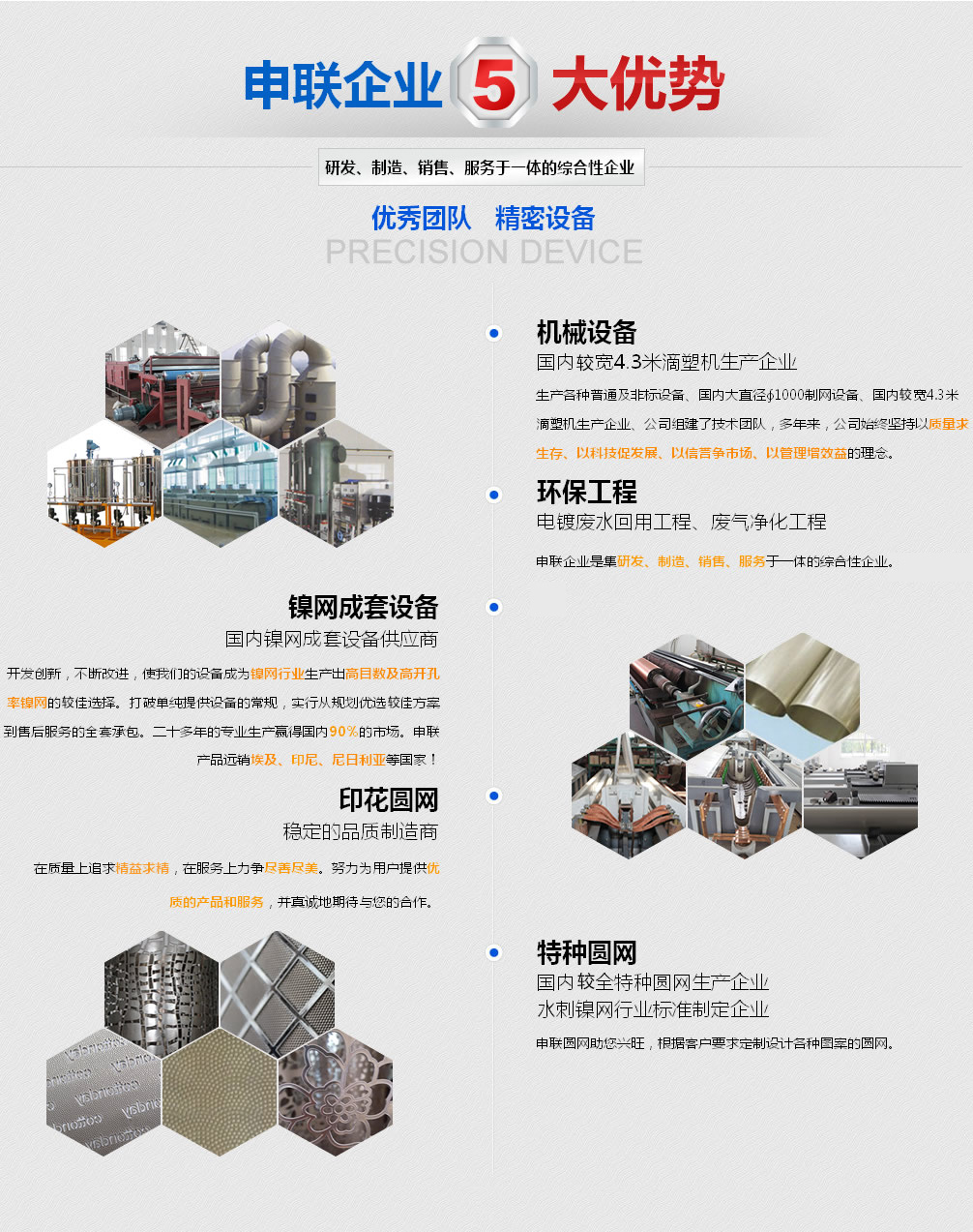 申聯(lián)企業(yè)是一家集機(jī)械設(shè)備、環(huán)保工程、鎳網(wǎng)生產(chǎn)成套設(shè)備、印染鎳網(wǎng)、特種鎳網(wǎng)等系列相關(guān)產(chǎn)品的研發(fā)、制造、銷(xiāo)售、售后服務(wù)于一體的綜合性企業(yè)。企業(yè)屬下有宜興申聯(lián)機(jī)械制造有限公司和宜興市申聯(lián)環(huán)保紡織器材廠(chǎng)有限公司。
